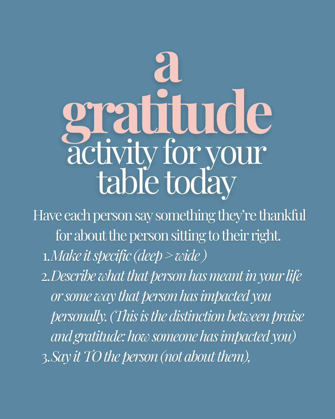 *If you’re at a smaller table or have the time, you could go around one person at a time, and have everyone say something they’re thankful for about that one person. 🥹