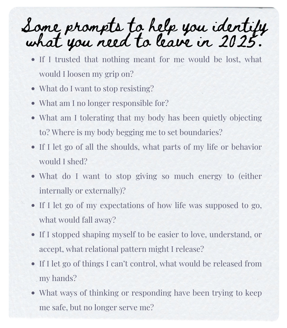 I love all those posts about ‘letting go’ or ‘what you’re leaving behind in 2025.’ Love this concept, but when I sat down to do it for myself, I drew a blank. I realized I needed some prompts to get my mind going that were a little more specific, so I came up with some new prompts that I’m processing through: